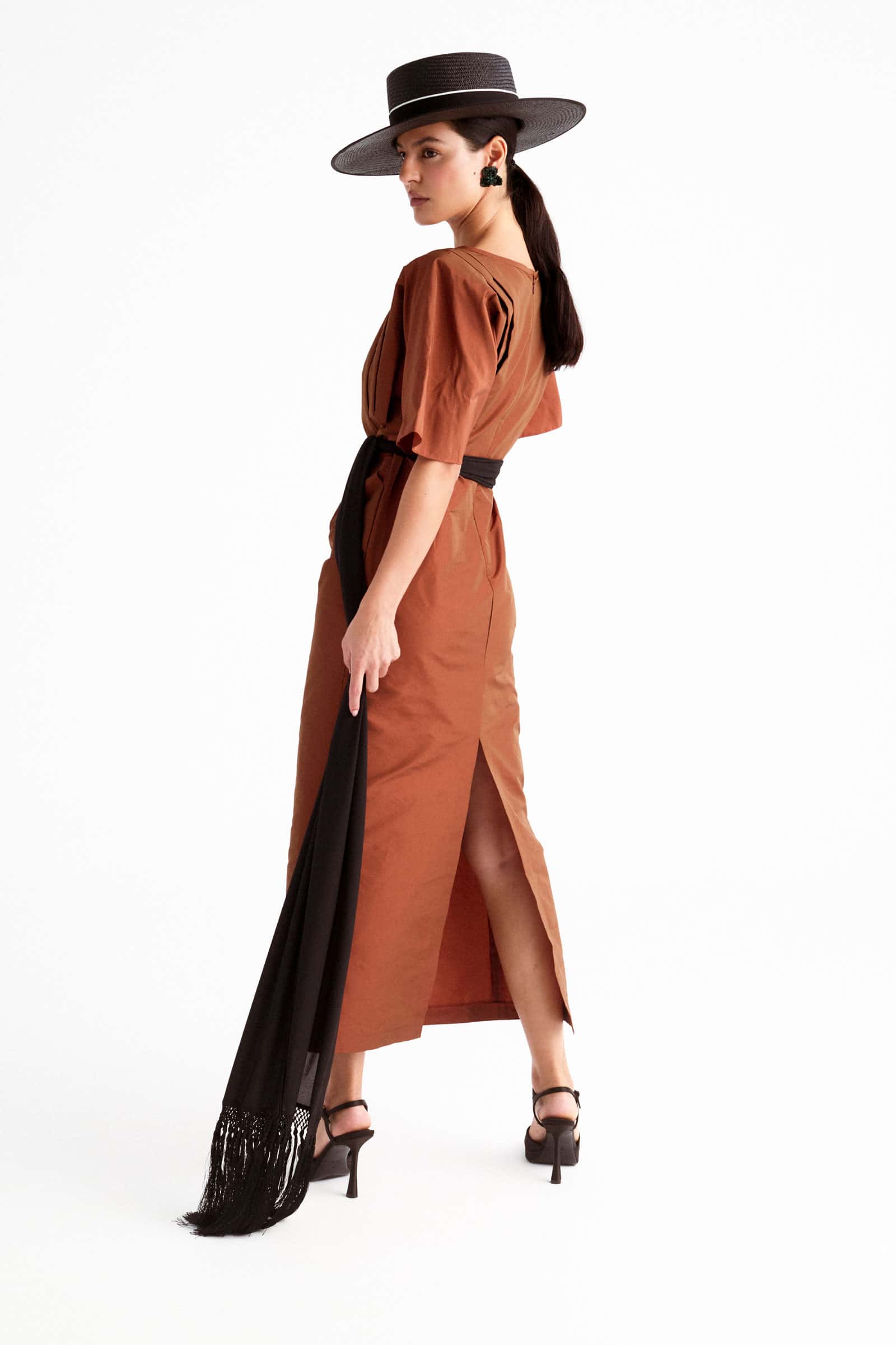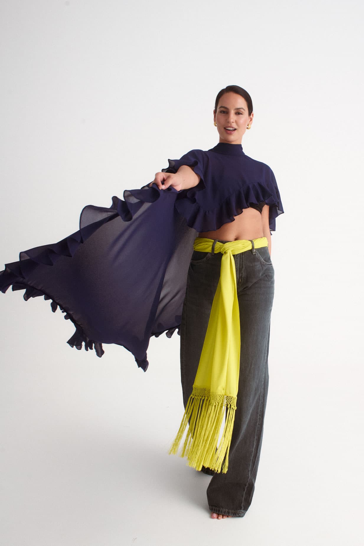 Las bufandas de seda con flecos de Carmen Fitz son el accesorio perfecto para elevar cualquier look. Confeccionadas artesanalmente, destacan por su textura ligera, acabado brillante y flecos anudados a mano. Disponibles en terracota, rosa, negro, amarillo y gris, aportan un toque de color, movimiento y sofisticación a los estilismos de la colección.