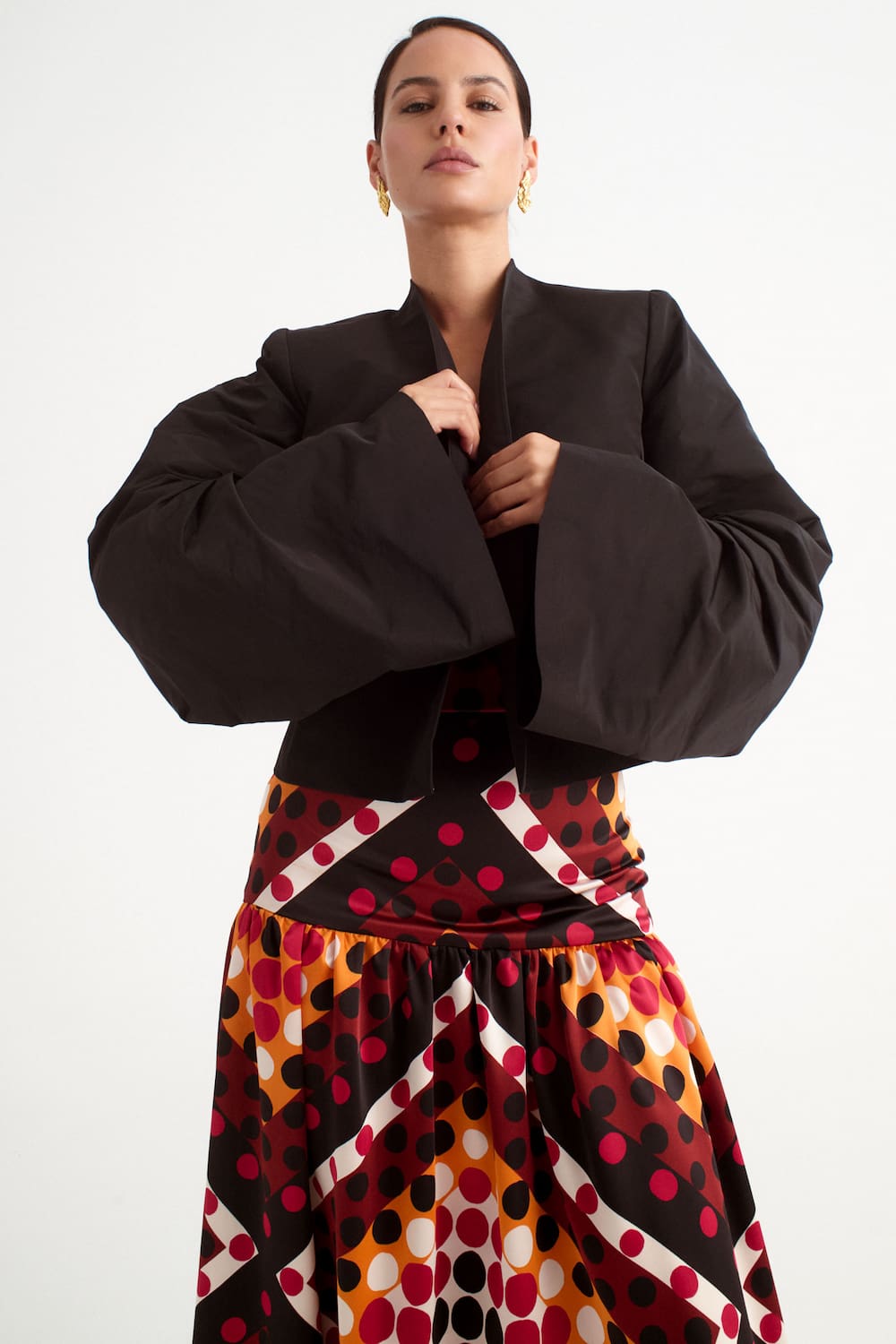 Ideal para eventos de otoño e invierno, esta chaqueta negra puede combinarse con prendas estampadas o lisas de la colección, como faldas midi o pantalones de corte fluido. Su acabado satinado y su diseño sin cierres visibles aportan sofisticación y permiten múltiples interpretaciones, desde un look de invitada elegante hasta una propuesta más urbana.