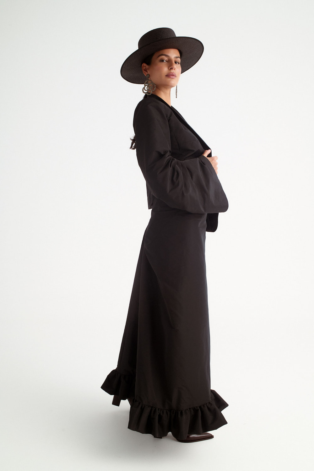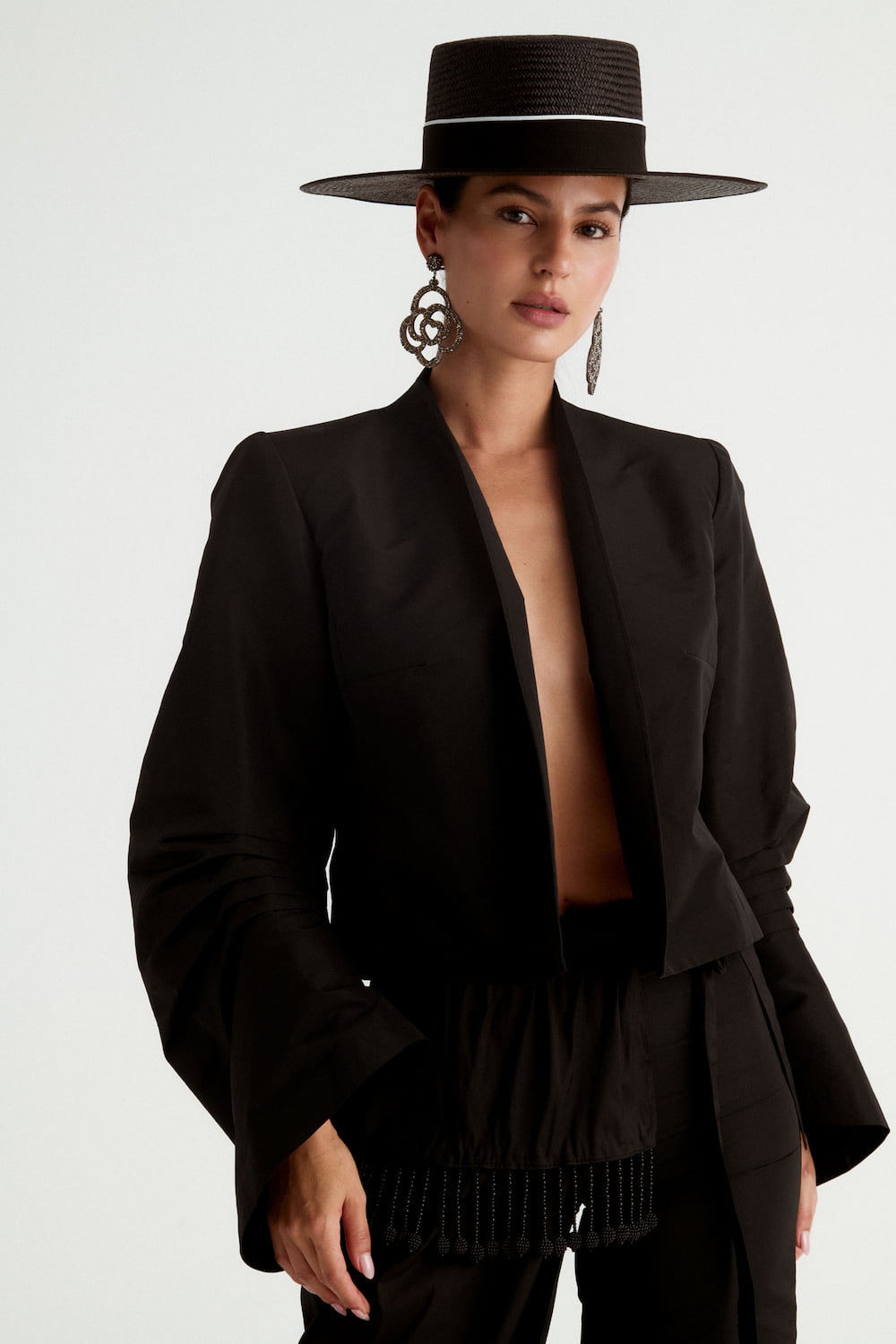 Chaqueta corta de invitada confeccionada en tafetán negro. Su estructura con mangas anchas y volumen aporta un toque sofisticado y contemporáneo. Una prenda versátil que combina elegancia, carácter y diseño, perfecta para completar tus looks de otoño e invierno.