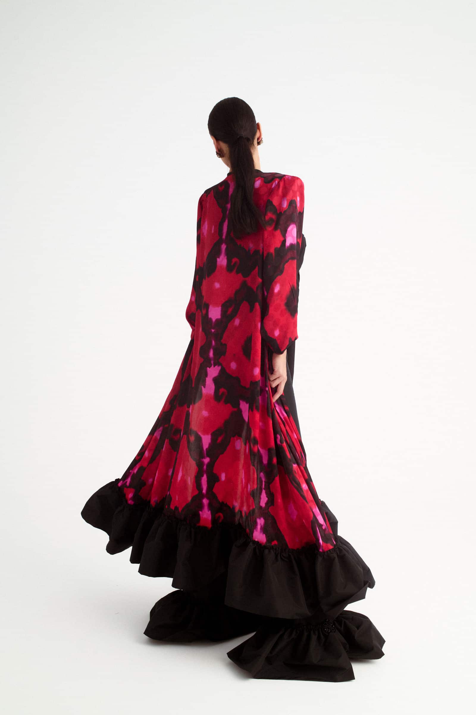 Confeccionado en satén de alta calidad, este overcoat combina un estampado de fantasía en tonos fucsia, granate y negro con un volante amplio en el bajo, también en satén, que aporta movimiento y volumen. Su diseño fluido y ligero permite que se adapte con naturalidad a diferentes estilos de invitada.