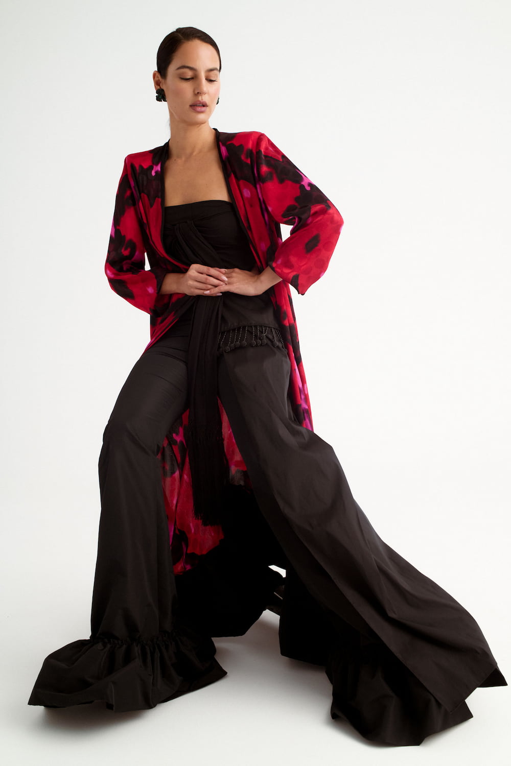 Overcoat largo confeccionado en satén estampado de fantasía, con volante de satén negro en el bajo. Una prenda única y sofisticada, de edición limitada, ideal para elevar cualquier look de invitada. Combínalo con el pantalón de tafetán con volante y un top básico negro para un conjunto espectacular de otoño.