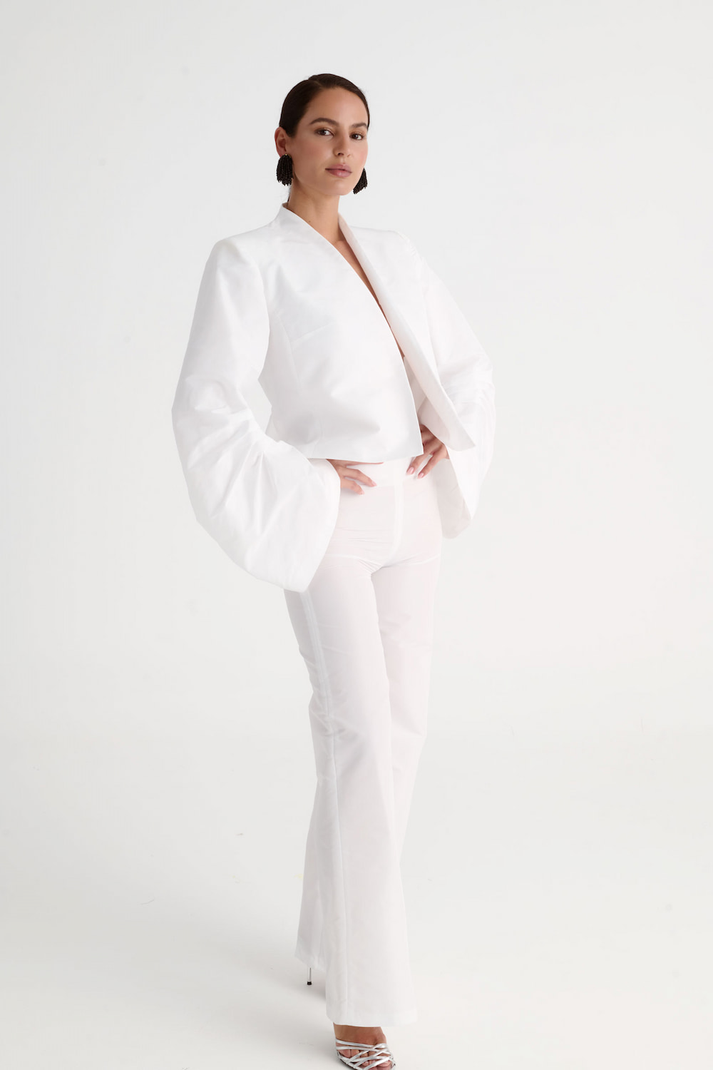 Con la chaqueta corta blanca de tafetán para un conjunto monocromático moderno.