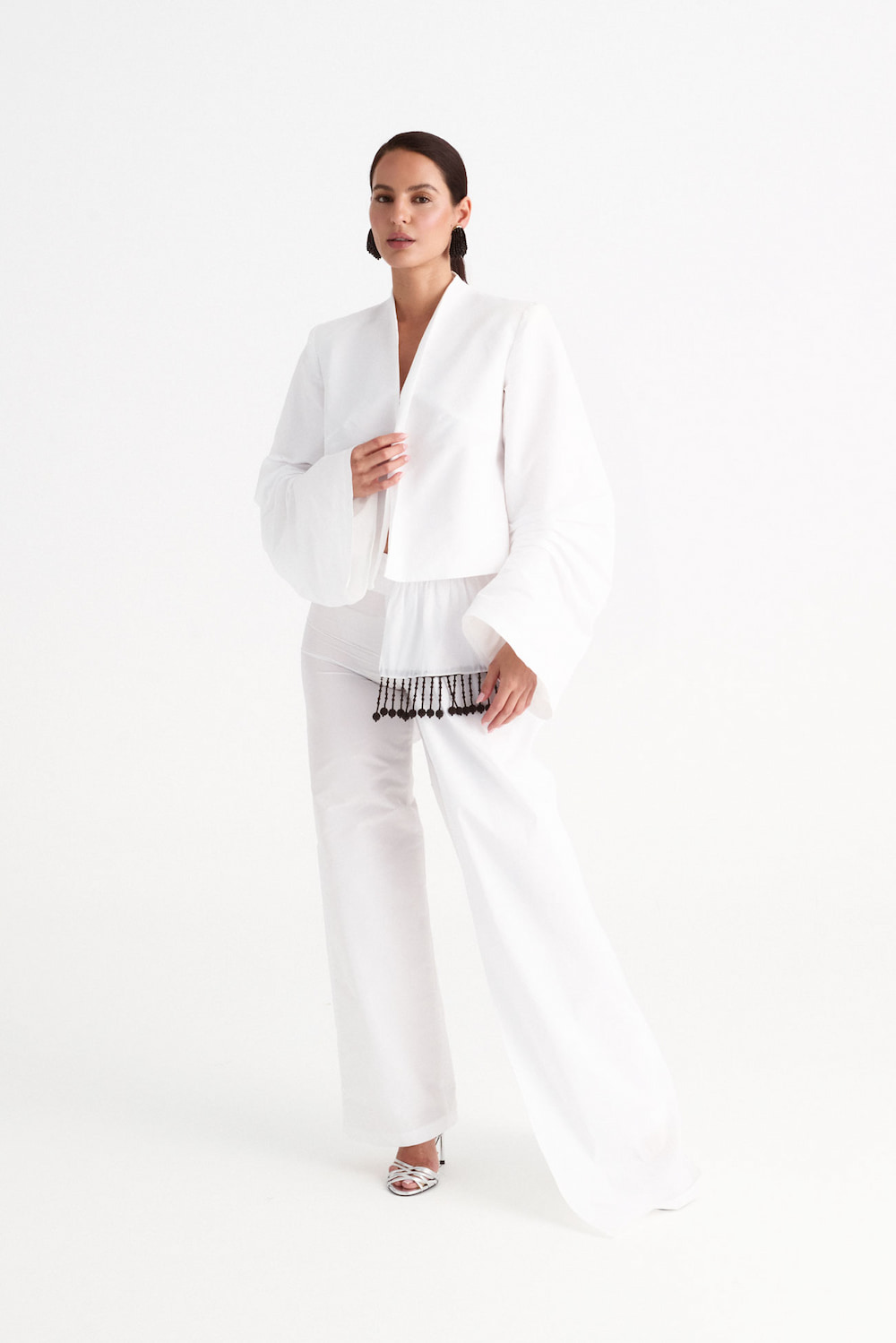 Diseñado para acompañar a la chaqueta corta blanca de tafetán de la misma colección, este pantalón completa un look total white lleno de elegancia y armonía. Una apuesta segura para bodas de otoño, eventos de día o cenas sofisticadas, donde la naturalidad y el diseño sean protagonistas.