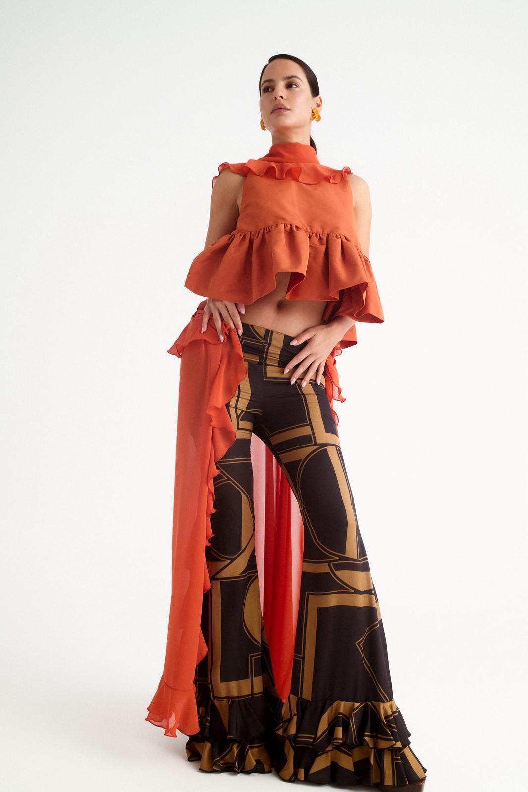 Eleva tu próximo look de invitada con este pantalón de diseño exclusivo, una pieza que fusiona la sofisticación de un estampado geométrico en tonos tierra y negro con la audacia de una silueta acampanada. Confeccionado artesanalmente en España, destaca por su talle alto que estiliza la figura y un espectacular acabado de volantes en el bajo que aporta un movimiento inigualable a cada paso.