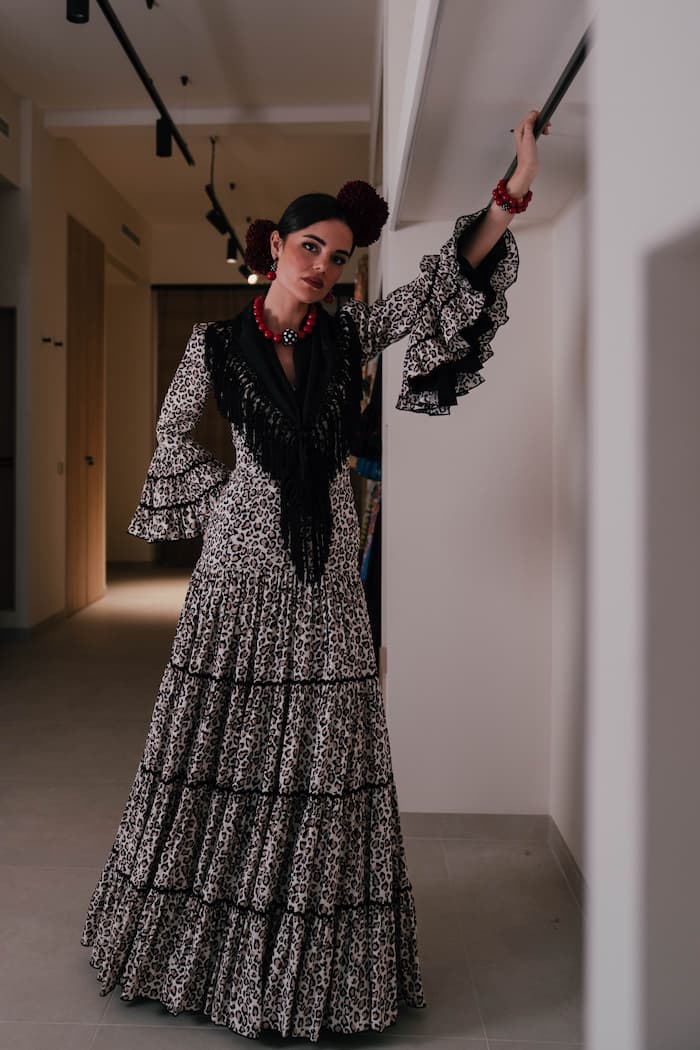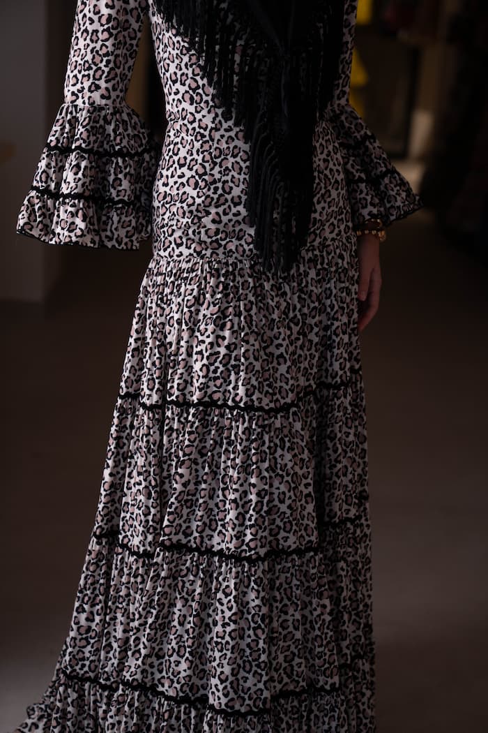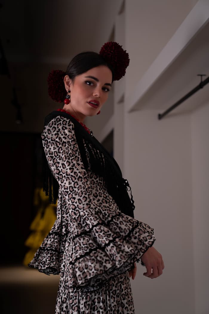 Cada pieza de la colección Aflamencá está diseñada y confeccionada artesanalmente en España, reflejando el compromiso de la firma con la excelencia y la autenticidad. Este vestido de flamenca de viscosa con estampado animal print es una muestra de la capacidad de la moda flamenca para reinventarse, adaptando su herencia a un lenguaje moderno y cosmopolita.