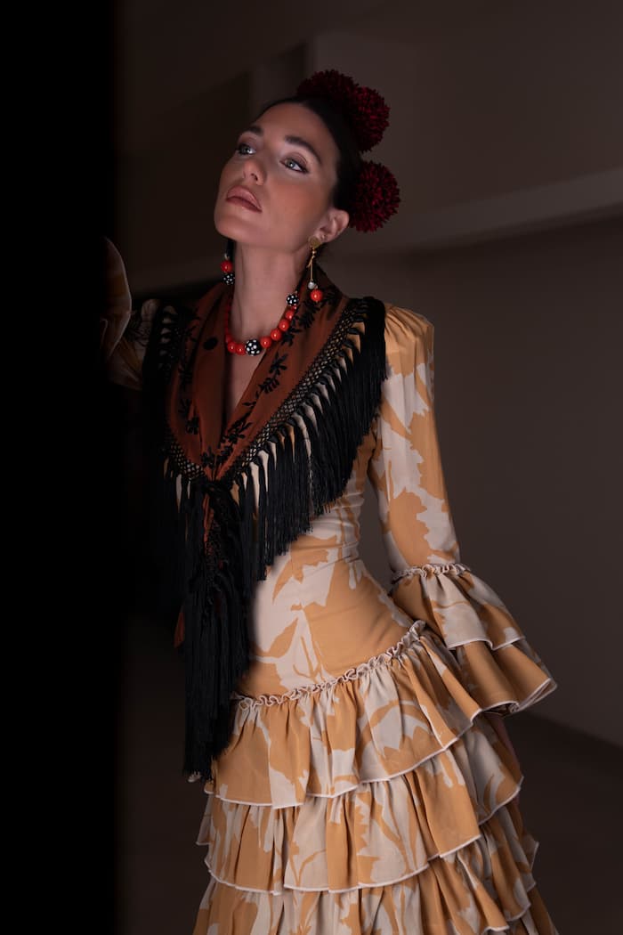 El vestido de flamenca en Georgette estampado es una de las piezas más evocadoras de la colección Aflamencá de Carmen Fitz. Su diseño destaca por la ligereza del tejido y la sutileza del estampado, que combina tonos dorados, beige y crema sobre una base fluida que acompaña cada movimiento con una caída impecable.
