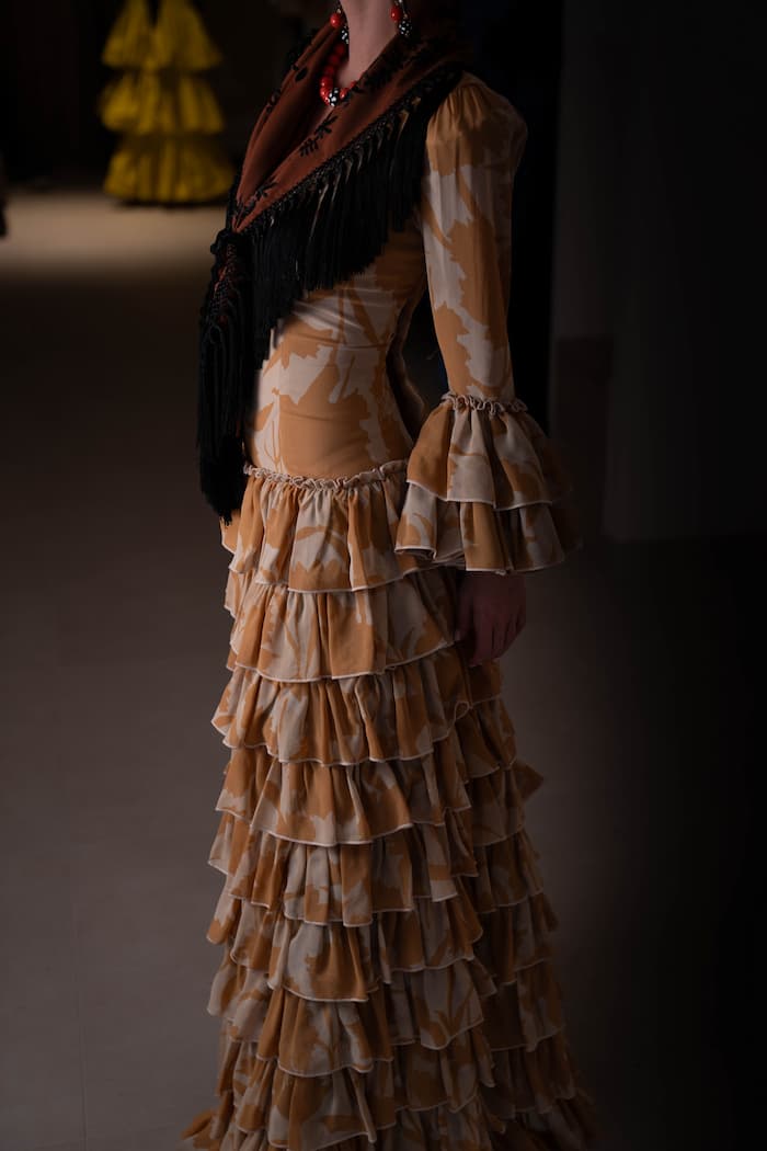 El patrón clásico de falda canastera con múltiples volantes aporta volumen y dinamismo sin perder elegancia, mientras que las mangas con volantes en cascada enmarcan los brazos con delicadeza y carácter. Su silueta entallada realza la figura, evocando la fuerza y la feminidad propias de la moda flamenca.