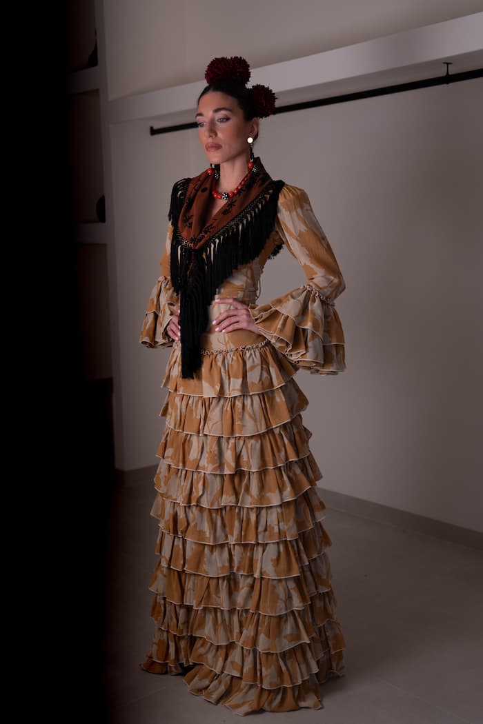 El vestido de flamenca en Georgette estampado de Carmen Fitz reinterpreta la elegancia clásica del traje andaluz con un tejido ligero, fluido y de gran movimiento. Confeccionado en Georgette de alta calidad, su estampado abstracto en tonos tierra y beige aporta una presencia cálida, natural y sofisticada.