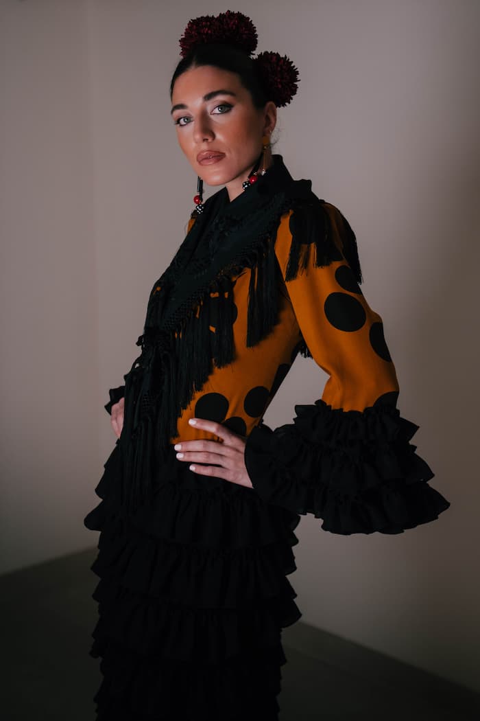 Su corte entallado realza la silueta femenina, mientras que la falda canastera con volantes superpuestos en negro aporta volumen, ritmo y una elegancia atemporal. Las mangas largas con volantes dobles evocan la fuerza del flamenco y el movimiento característico de la moda andaluza más auténtica.