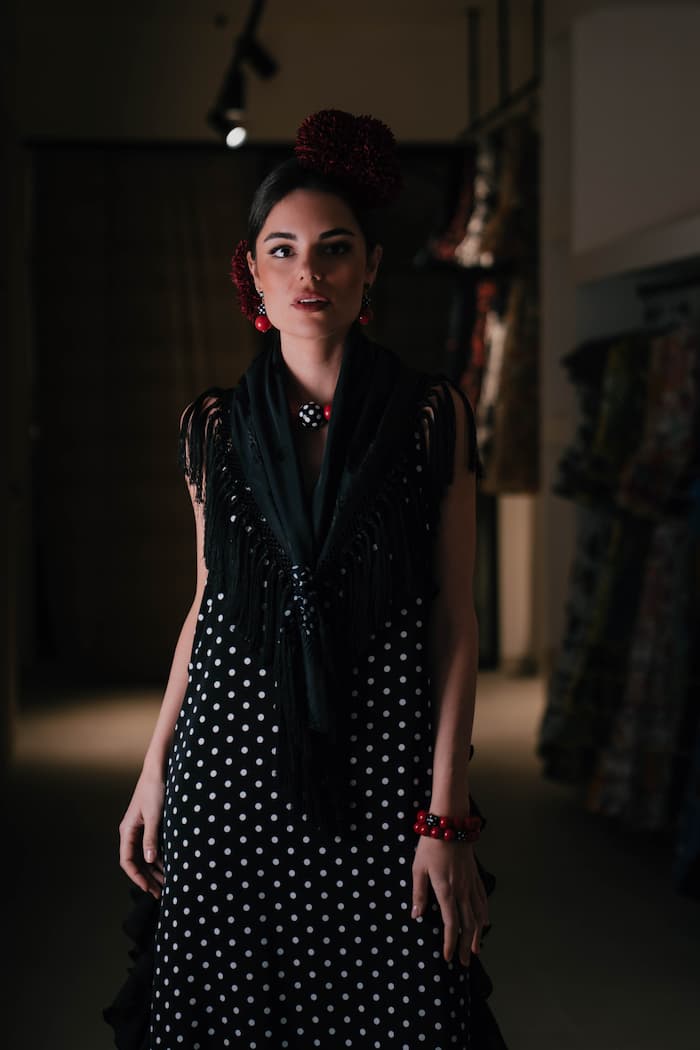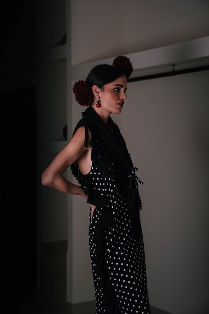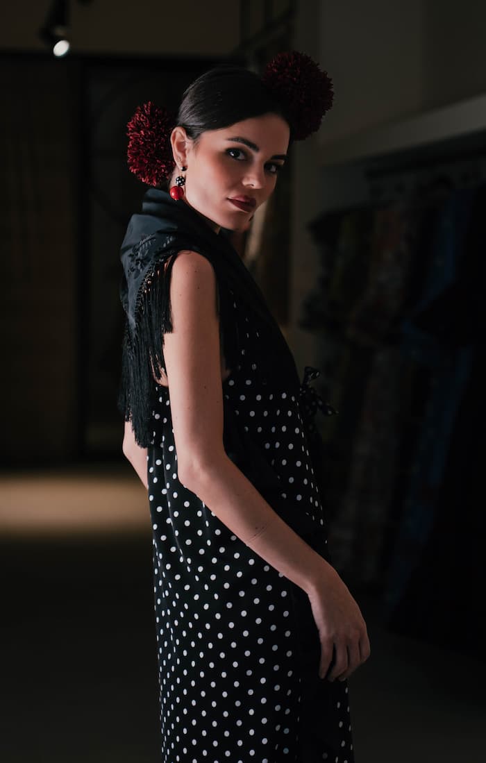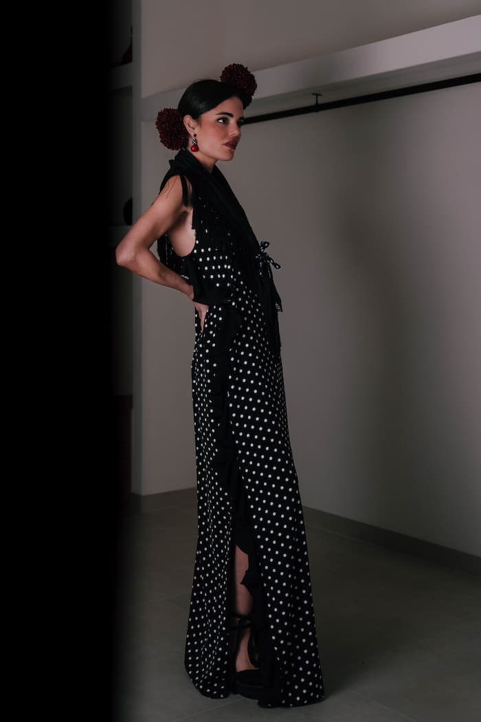 El vestido de invitada en crepé de lunares y georgette negro es una declaración de estilo: sobrio, contemporáneo y con el inconfundible espíritu andaluz reinterpretado desde la elegancia más moderna.