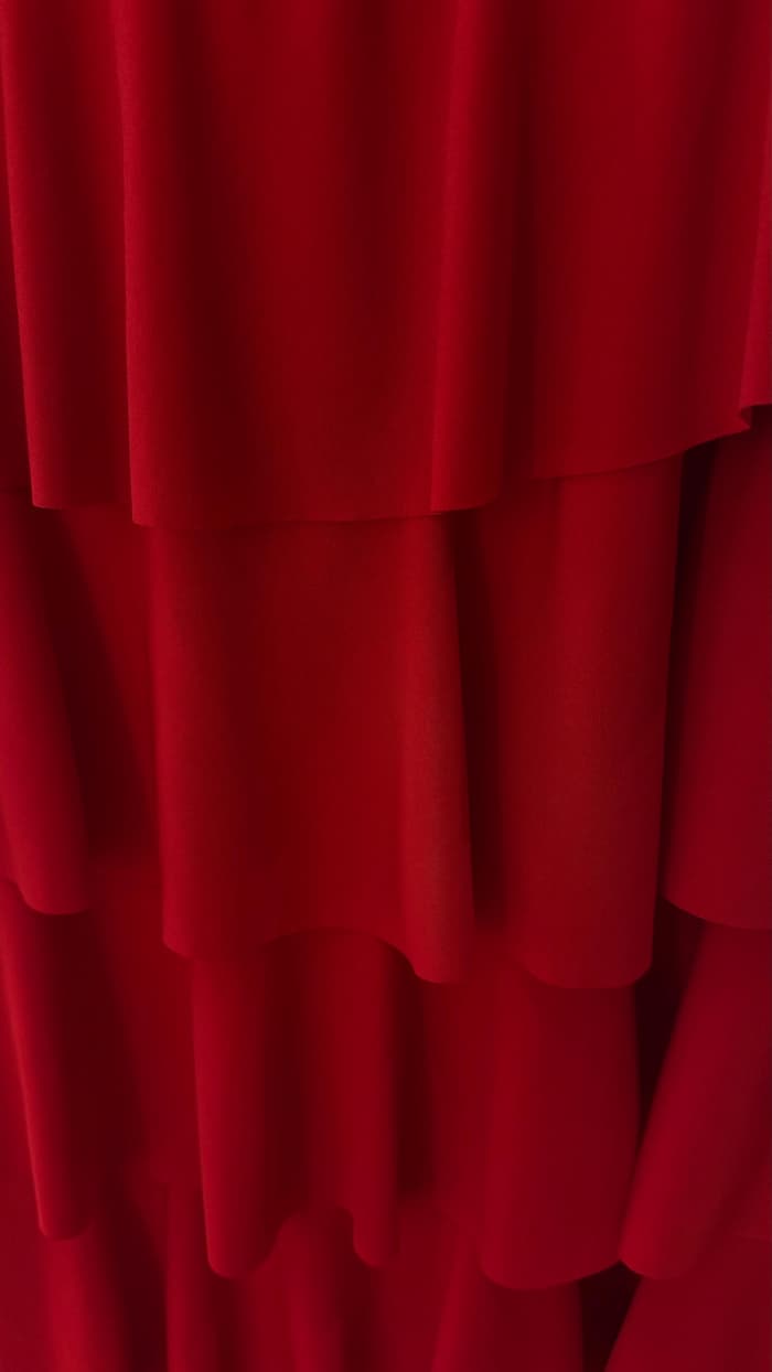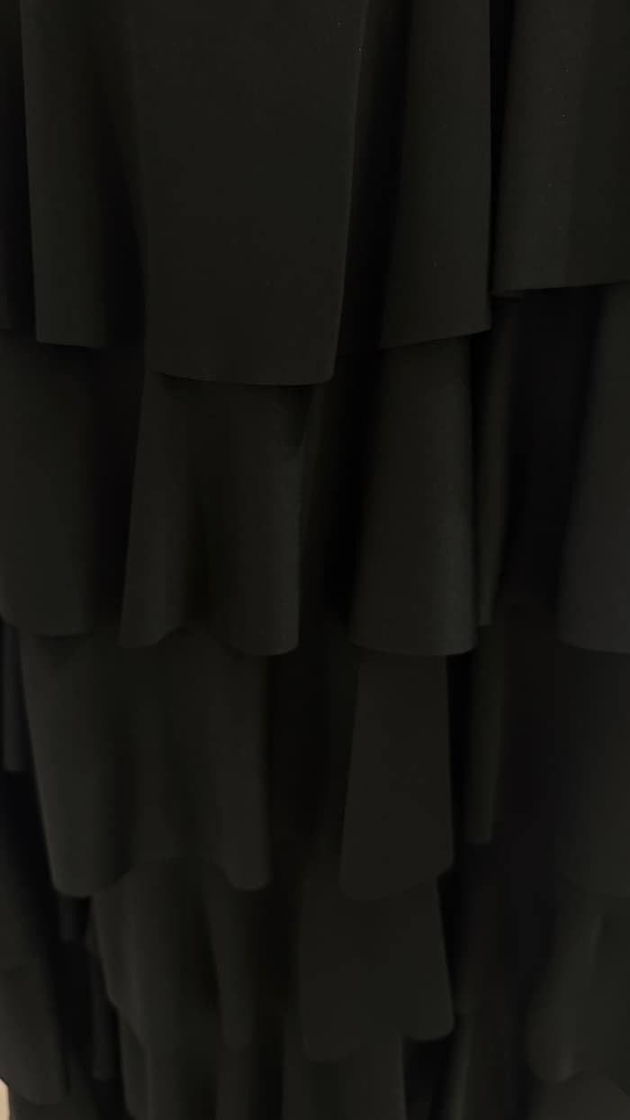 El vestido de invitada de punto negro o rojo con volantes es una pieza esencial en el armario de cualquier mujer que valore la elegancia minimalista. Su cuello cerrado y mangas largas aportan equilibrio y distinción, mientras que la falda de volantes en cascada ofrece movimiento y dinamismo, evocando el espíritu flamenco característico de Carmen Fitz.