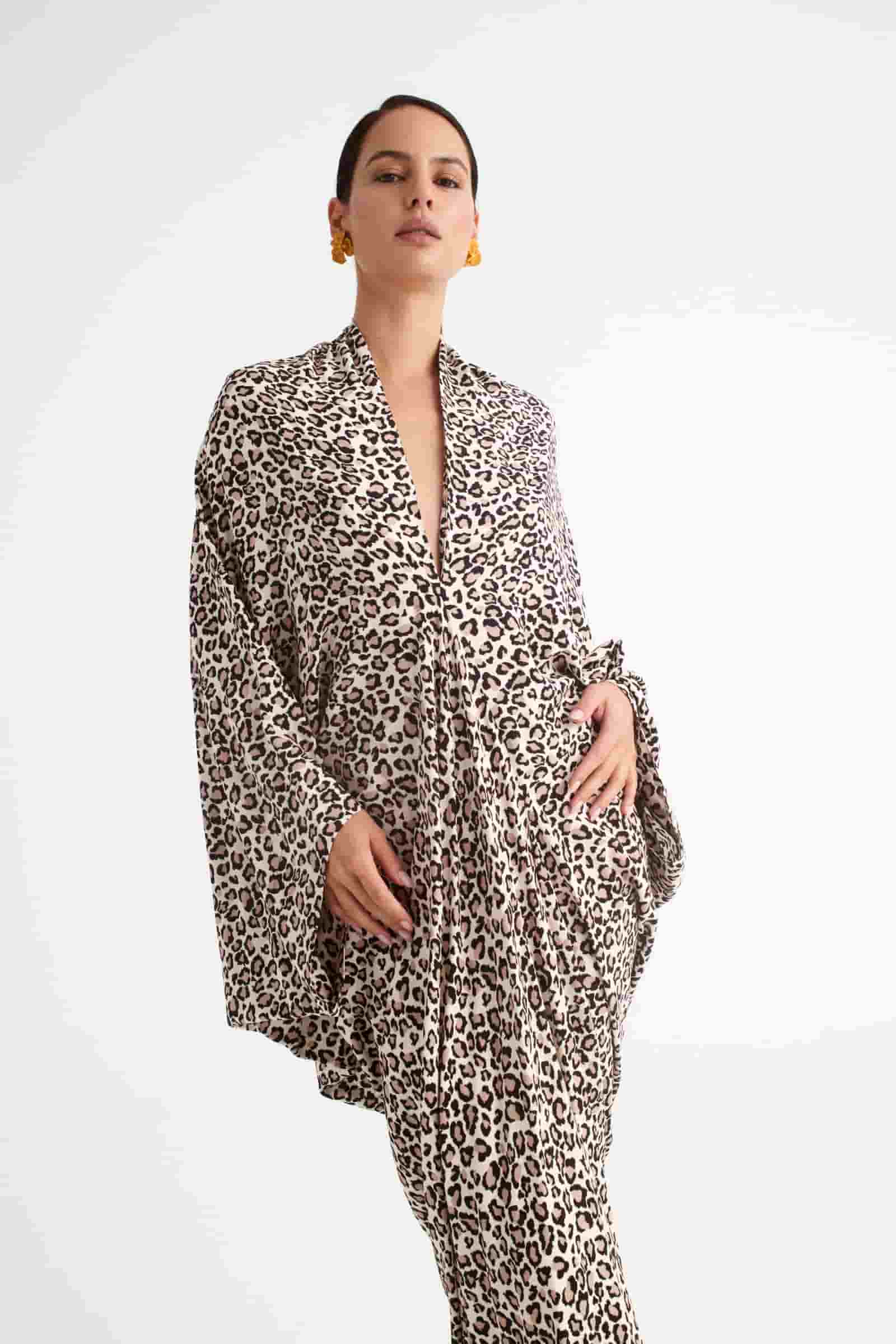 El modelo Shaira presenta un escote cruzado en pico, mangas amplias tipo kimono y una estructura envolvente que se adapta con suavidad a distintas siluetas. Su estampado leopardo en tonos neutros aporta un toque salvaje y elegante a la vez, ideal para quienes buscan destacar con estilo sin renunciar al confort.